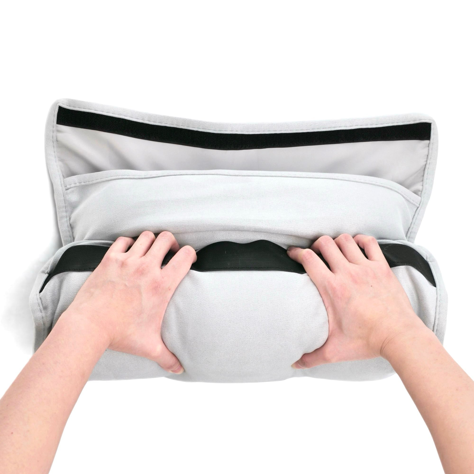 Luxurious vegan suede pouch packs the pillow down to a quarter the size so you always have space for luxury sleep.